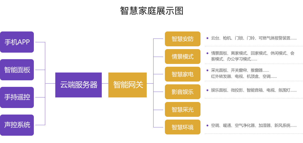 全屋智能家庭系統,結合物聯網、云計算、移動互聯網和大數據等技術,讓家庭智能產品與人實現互聯互動,打造出更宜人居、更節能環保的現代家庭生態系統。它主要包括家庭智慧安防、情景模式、智慧家電、影音娛樂、智慧采光、智慧環境等功能模塊。